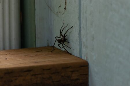 A small brown spider works diligently to weave its delicate web in a shadowy corner, showing its intricate craftsmanship and natural habitat in the evening.
