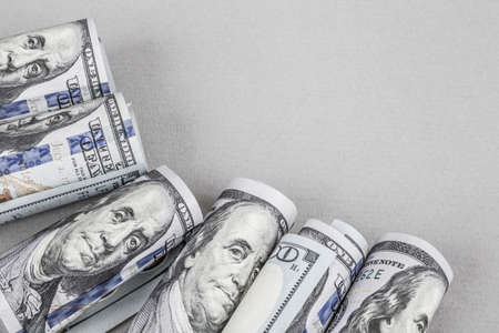 Creative abstract background with one hundred dollar bills with copy space. Five banknotes mounted vertically on a gray background. Close-up, selective focus.