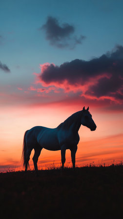 Silhouette of a horse at sunset on a tranquil evening, dramatic sky. Nature and serenity concept