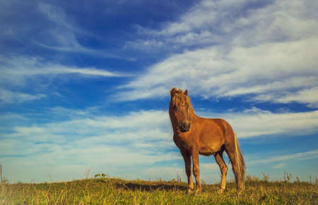 Icelandic horse animal in Iceland at sunset. Close up photo