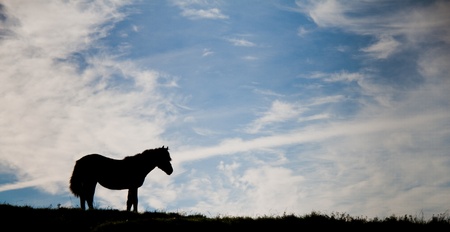 horse silhouette in the meadow with a blue sky, animals in the wild