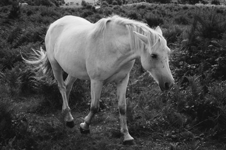 A grayscale shot of white horse grazing on the pasture