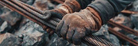 A worker wearing dirty gloves grips thick steel cables at a construction site on a sunny day, surrounded by rough rocks and machinery.