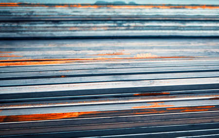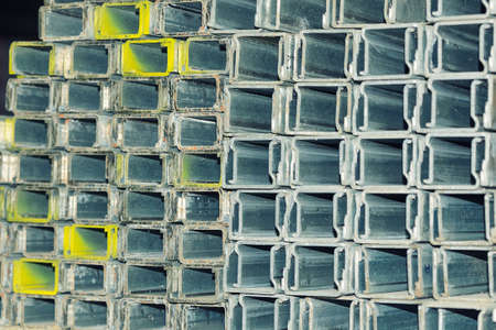Abstract stack of aluminum profiles close up, industrial background macro, selective focus