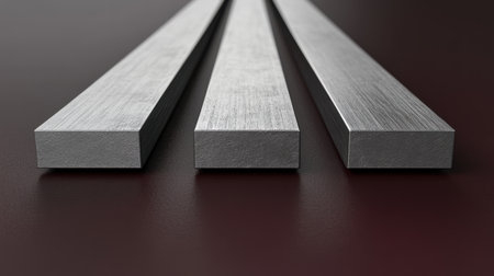 This image features three rectangular metal bars with smooth surfaces aligned horizontally on a brown background. Ideal for showcasing industrial and construction materials.