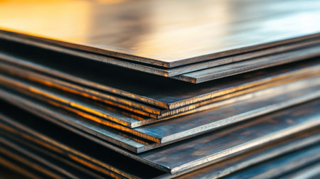 This image showcases a close-up view of stacked metal sheets, emphasizing their texture and reflections under natural lighting in an industrial setting.