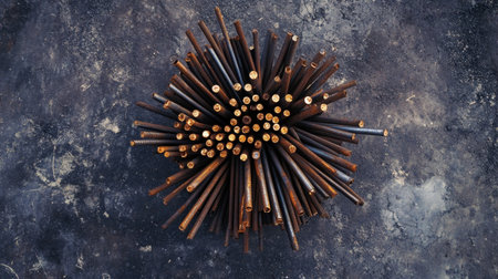 A captivating top view of wooden dowels arranged in an intricate, circular formation atop a dark surface, highlighting texture and design elements.