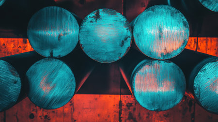 This image presents an abstract composition of circular metal rods illuminated with vibrant blue and orange tones, showcasing intricate textures and industry aesthetics.