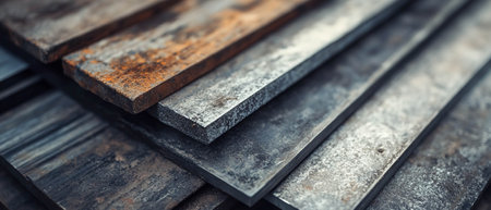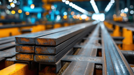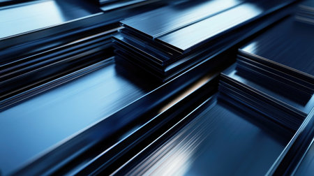 This close-up image showcases a neat stack of metallic profiles with a sleek, reflective surface. The lines and geometric shapes create a modern aesthetic perfect for industrial themes.