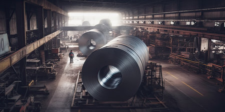 Roll of steel , colour , sheet in factory , Generative AI .