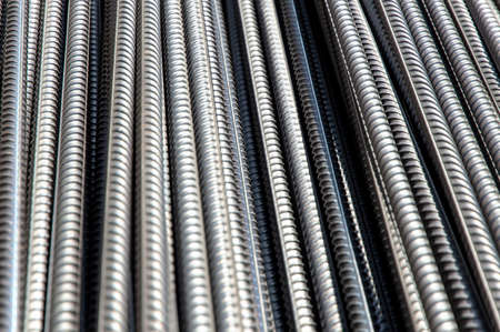 rough iron grunge background: glittering new clean reinforcement bars, short focus