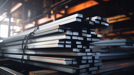Stacked steel bars in a warehouse, close-up view. Industrial materials and manufacturing concept