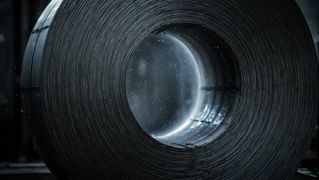 Industrial steel roll under bright lights gleaming with metallic shine dust particles in the air