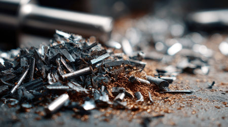 This detailed image showcases metal shavings and sawdust scattered on a workshop surface, emphasizing the intricacies of metalworking and machining processes.