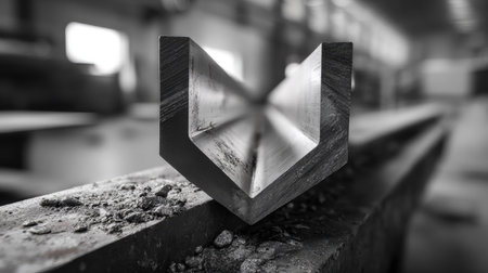 A close-up of a single metal corner profile resting on a workbench, surrounded by dust, presented in a striking black and white format.