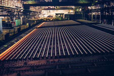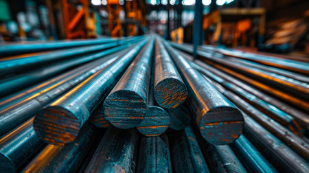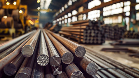 Steel pipes and metal rods stacked in a manufacturing facility as part of the metal rolling process. Selective focus.