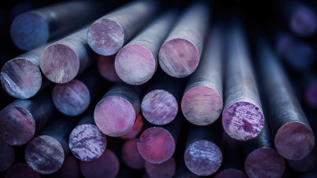 This image showcases a close-up view of industrial metal rods arranged in a dark setting, highlighting their textured surfaces and reflective qualities.