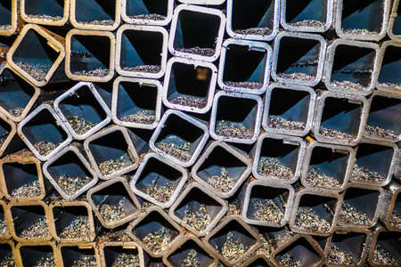 Perspective of pile of construction metals in factory. They consist of square and rectangular steel tubes, iron pipes and bars.