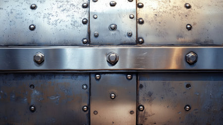Close-up view of an industrial metal surface featuring rivets and screws, showcasing unique textures and reflections that enhance architectural design elements.