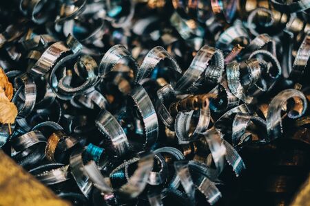 Steel scrap materials recycling. Aluminum chip waste after machining metal parts on a cnc lathe. Closeup twisted spiral steel shavings. Small roughness sharpness, possible granularity, blurred focus