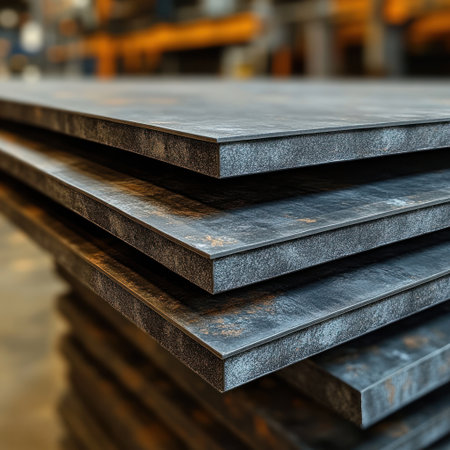 Heavy steel plates rest in a well organized industrial space showing precision