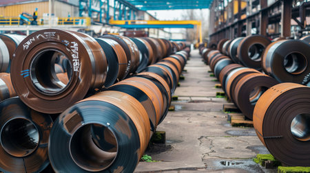 Highquality stainless steel coils are meticulously stacked in a modern and efficient industrial facility. Generative AI