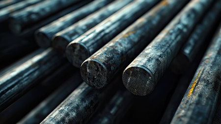 Close-up view showing the dark steel rods that are stacked neatly for various industrial uses. Generative AI