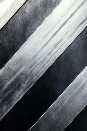 A striking abstract display of metallic textures showcases dynamic streaks in high contrast monochrome tones, creating a sense of movement and energy across the surface.