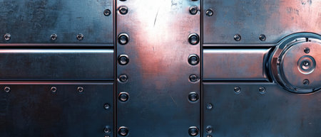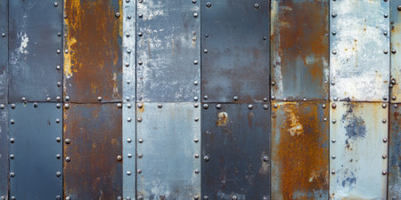 Industrial metal sheet background with riveted panels, rugged textures, and worn edges.