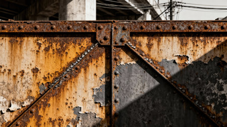 Detailed structural steel surface displaying heavy orange ferric oxide rust and flaking dark paint sections, connected by rivets and visible welds, under strong sunlight against a concrete background.