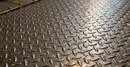 A close-up of a diamond steel plate with raised patterns, reflecting light dynamically.