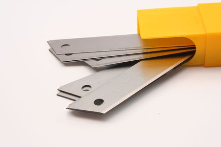 Background made from a macro photo of pile of razor blades with yellow blades, isolated on a white background.