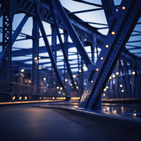 A steel bridge silhouetted against a soft sky, showcasing intricate metal framework, railings, and minimal pedestrian activity under subtle lighting