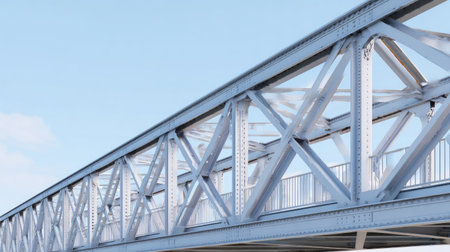 This image captures a detailed view of a steel bridge structure against a clear blue sky, highlighting architectural design and engineering features that emphasize modern infrastructure.