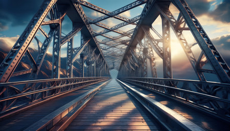 A stunning image of an industrial bridge showcasing its robust steel structure during sunrise, with sunlight beautifully reflecting on the water. The city skyline adds depth.