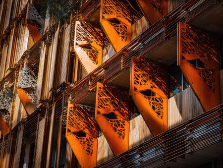 This image captures an artistic perspective of large, rusty metal structures in a contemporary architectural environment, showcasing unique textures and light interplay.