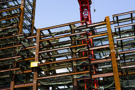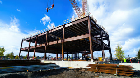 This image depicts a modern steel construction site featuring a large structure, a crane, and clear blue skies, highlighting progress in urban development and engineering.