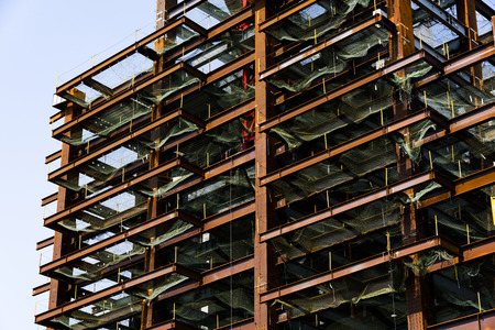 Urban building skeleton showing concrete floors and steel supports in open-frame design