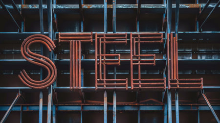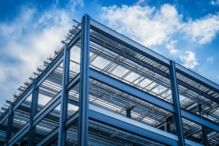 A close-up view of an industrial construction framework showcasing steel beams and structural supports, capturing modern architecture and vivid colors.