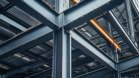 A captivating glimpse into an industrial construction site featuring exposed steel beams and natural light illuminating the workspace, highlighting urban architecture evolution.