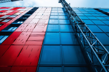 Workers are assembling a modern building adorned with vibrant red and blue panels while a tall crane reaches toward the sky against a cloudy backdrop.