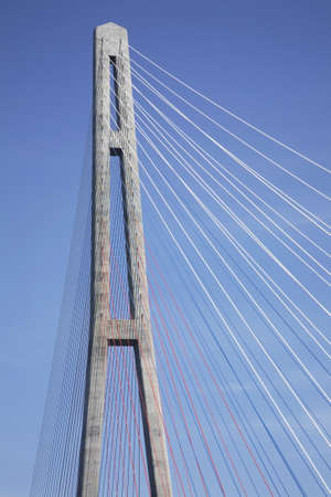 cable-stayed bridge close-up, main tower and cable against a blue sky