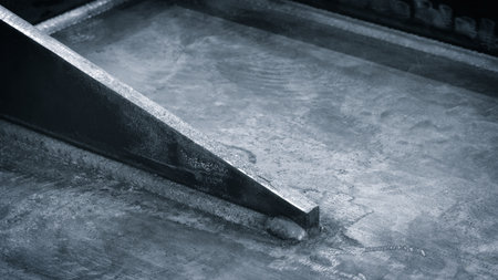close up and selective focus view of foundation reinforcement steel bars on wet cement ground, structure in an interior construction site.
