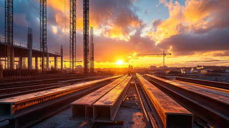 A stunning view of a construction site at sunset, capturing the beauty of industrial progress with steel beams and a dramatic sky, symbolizing modern development and effort.