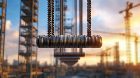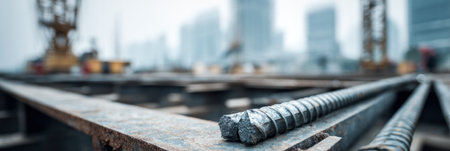 A close-up view of steel rebar showcases its textured surface at a bustling construction site, with heavy machinery subtly blurred in the background, depicting industry and strength.