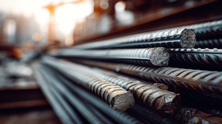 This image features a close-up view of rusted steel rebars lying on an industrial construction site during sunset. The blurred background enhances the atmospheric feel, highlighting textures and colors of these essential materials used in building infrastructure.