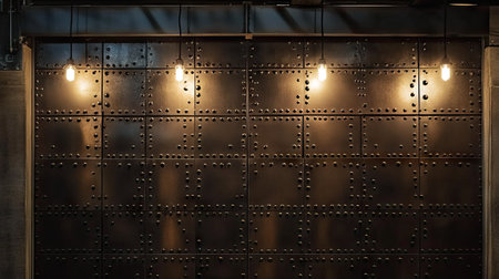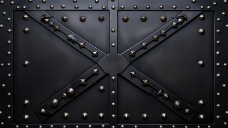 This image showcases a large industrial steel door featuring a rugged surface adorned with rivets and bolts. The geometric design creates a captivating visual for various backgrounds.