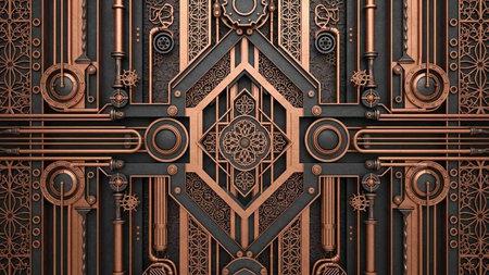 An intricate steampunk-inspired background featuring a complex arrangement of copper pipes, metallic gears, ornate grilles, and geometric patterns in dark gray and bronze tones.