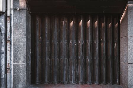 Garage or entrance closed metal gates texture with brown vertical fanfold lines of the door; front view of an accordion-folded painted door of a big gate on the street, common in Lisbon, Portugal