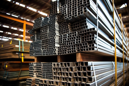 Rows of glaming metallic bars are neatly arranged in a vast factory, evoking a sense of precision and industrial strength ready for fabrication.